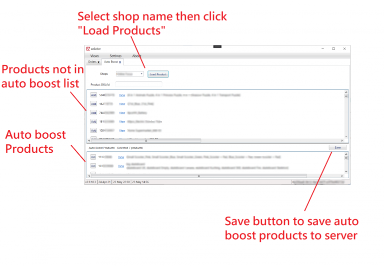 Use ezSeller to maintain auto boost product list, then save into server. After server get the product list, server will auto boost 5 products every 4 hours.